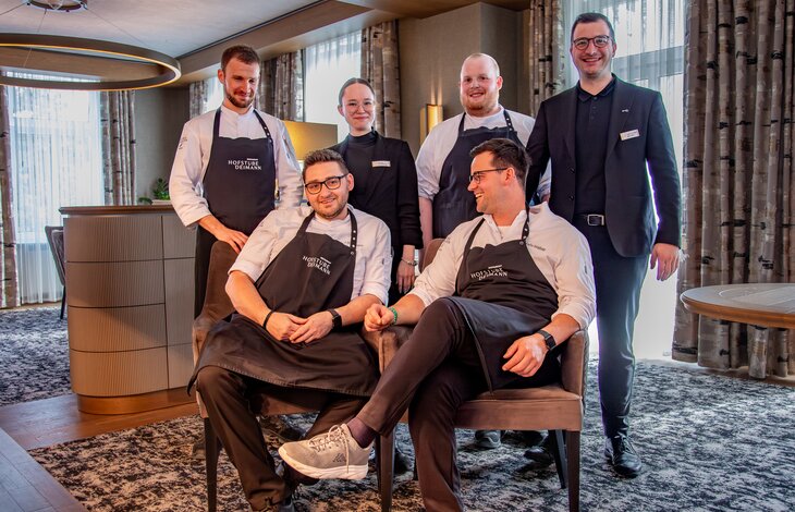 v.l.n.r., hinten: David Schick (Chef de Partie), Malina Dünnebacke (Hotelfachfrau), Jonas Wege (Commis de Cuisine), Alexander Severin (Chef de Rang)
